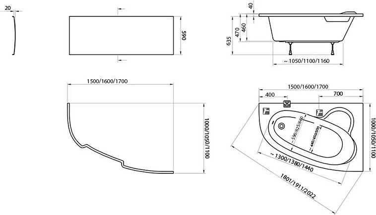 - Акриловая ванна Ravak Asymmetric 150x100 L с ножками