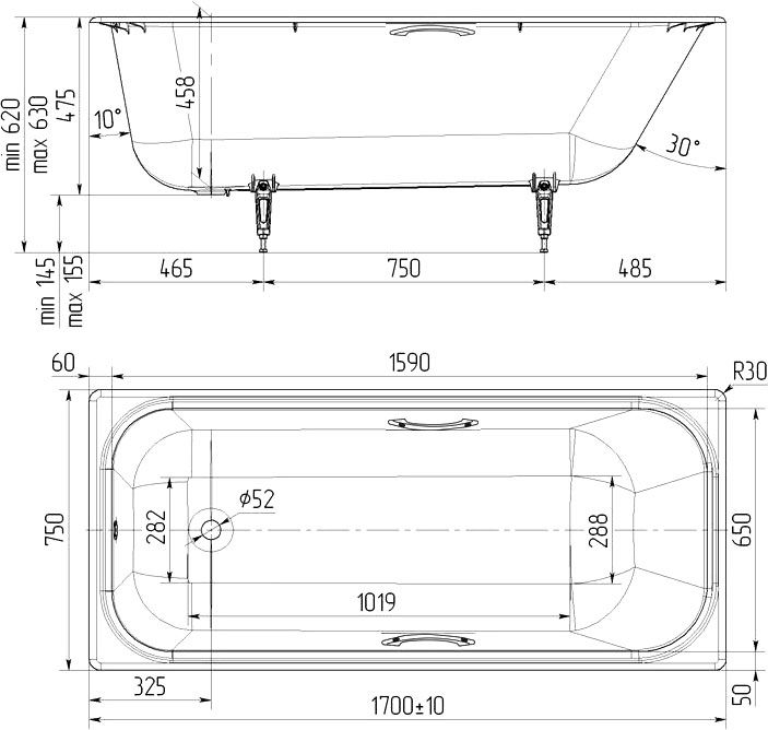 - Чугунная ванна Maroni Aura lux 170x75, с ручками